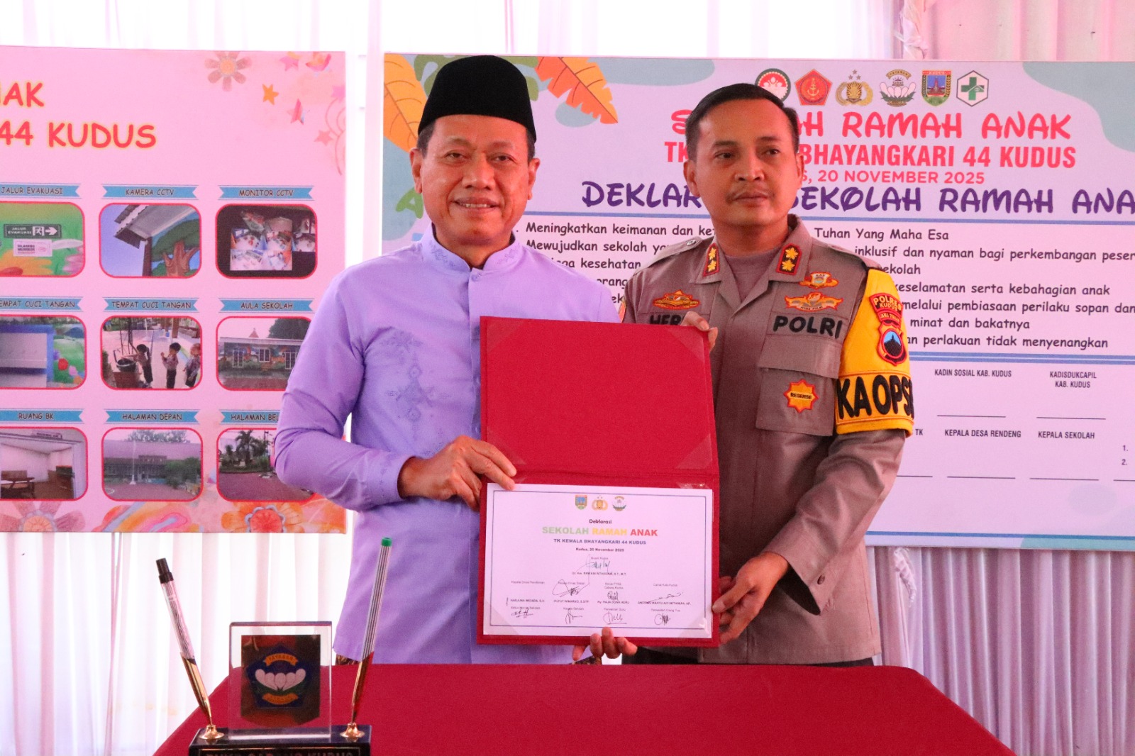 Kudus – Kapolres Kudus AKBP Heru Dwi Purnomo bersama Bupati Kudus Sam’ani Intakoris menghadiri kegiatan Penandatanganan Deklarasi Sekolah Ramah Anak di TK Kemala Bhayangkari 44 dan 45 Kudus, Kamis (20/11/2025).